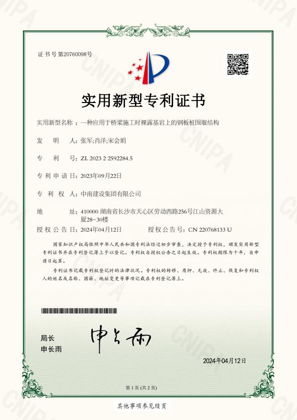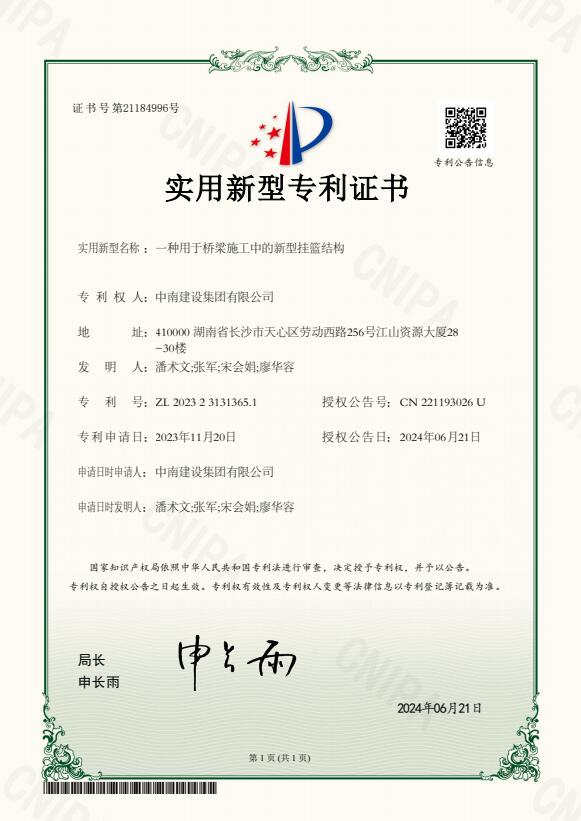 耒陽(yáng)市大河邊渡改橋工程是中南建設(shè)集團(tuán)承建的是湖南省重點(diǎn)旅游公路項(xiàng)目。自開(kāi)工以來(lái),公司高度重視,集中優(yōu)秀人才和優(yōu)質(zhì)資源,不斷攻克施工難題,加強(qiáng)核心技術(shù)攻關(guān),推動(dòng)科技成果加速轉(zhuǎn)化,加快形成新質(zhì)生產(chǎn)力。4月,公司獲得國(guó)家知識(shí)產(chǎn)權(quán)局頒發(fā)的《一種應(yīng)用于橋梁施工時(shí)裸露基巖上的鋼板樁圍堰結(jié)構(gòu)》實(shí)用新型專利。近日,再獲《一種用于橋梁施工中的新型掛籃結(jié)構(gòu)》實(shí)用新型專利。兩項(xiàng)成果的獲得,既增強(qiáng)了公司在路橋領(lǐng)域的建設(shè)實(shí)力,提振了大家的信心,也為整個(gè)行業(yè)的科技進(jìn)步貢獻(xiàn)了中南智慧和中南力量。